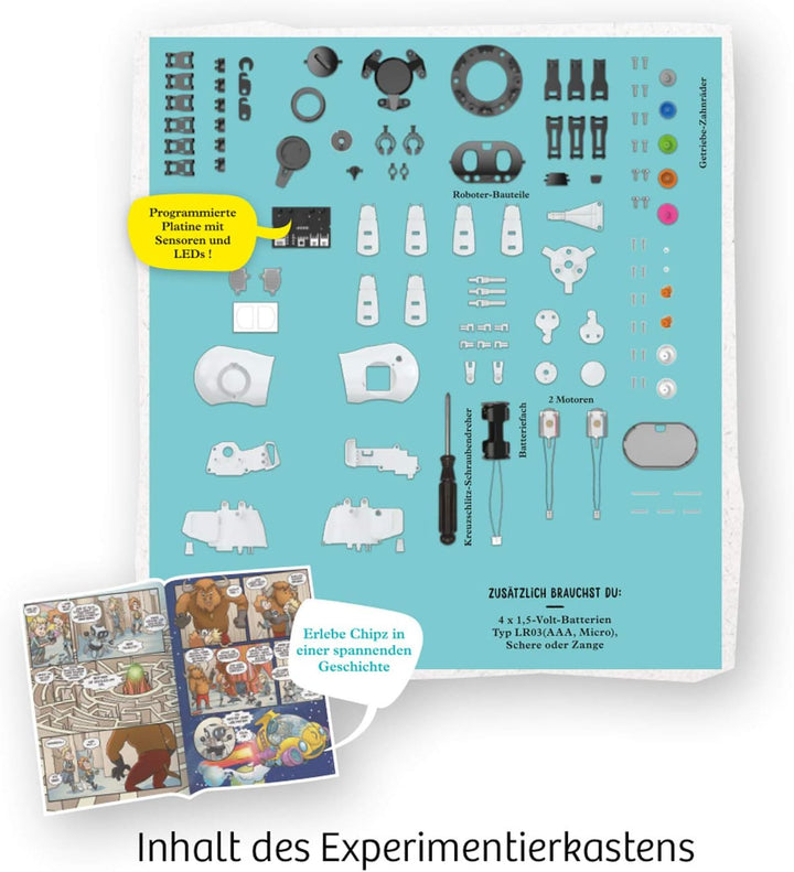 • Eine Comic-Geschichte lässt Chipz lebendig werden und die spannenden Hintergrundinfos vermitteln erste Einblicke in die Welt der Robotik und Physik.