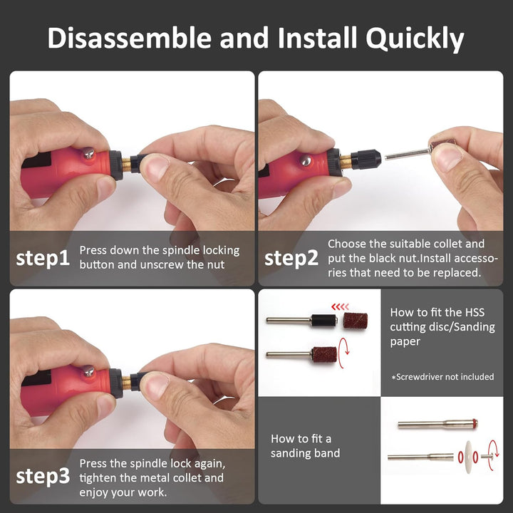 - 🔶 ACHTUNG - Unterschiedliches Werkzeugzubehör passt auf unterschiedliche Spannzangen. Wenn sich das Werkzeugzubehör leicht vom Kopf des Drehwerkzeugs lösen lässt, ersetzen Sie bitte eine neue Spannzange.