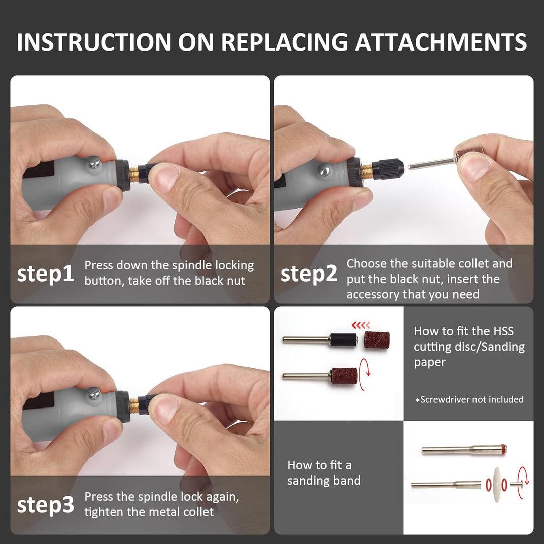 - 🔶 ACHTUNG - Unterschiedliches Werkzeugzubehör passt auf unterschiedliche Spannzangen. Wenn sich das Werkzeugzubehör leicht vom Kopf des Rotationswerkzeugs löst, tauschen Sie bitte eine neue Spannzange aus, damit es passt.