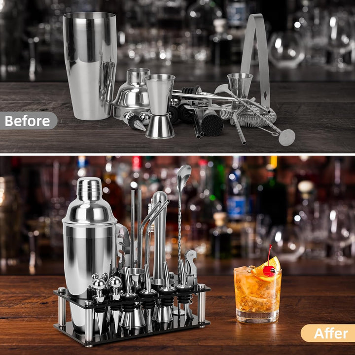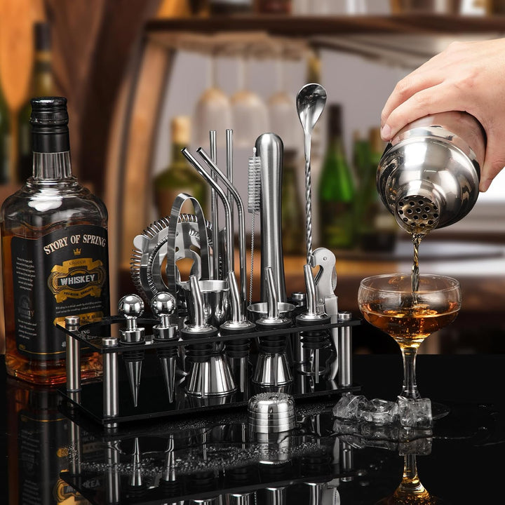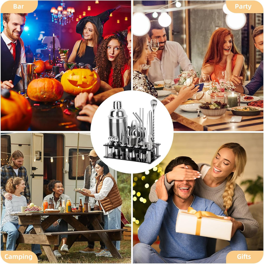 - đ·20Pcs Cocktail Shaker Set: Beinhaltet 1x Cocktail Shaker,2x Jigger,4x Ausgiesser,1x Eiszange,1x Muddler,2x Stopper,1x RĂŒhrlöffel,1x Korkenzieher,1x Sieb,1xBĂŒrste,4x Trinkhalme,1x stĂ€nder.