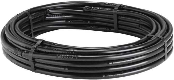 - PE-Rohr 1/2” (13 - 16 mm) mit integrierten, labyrinthartig angeordneten Tropfern (positioniert alle 33 cm), die jeweils 2 Liter/Stunde ausgeben und eine extrem gleichmässige Ausgabe auf der gesamten Fläche gewährleistet.