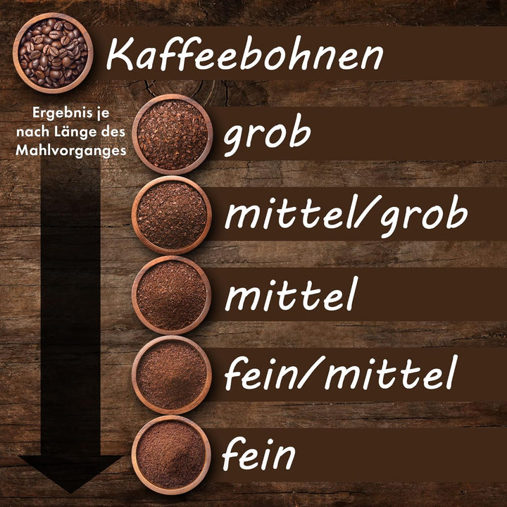 - Ganz nach Ihrem Geschmack lässt sich der Mahlgrad von fein bis grob anhand der Länge der Betriebsdauer wählen