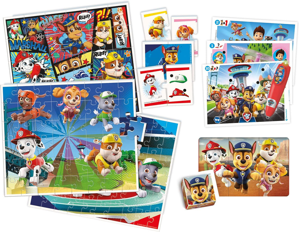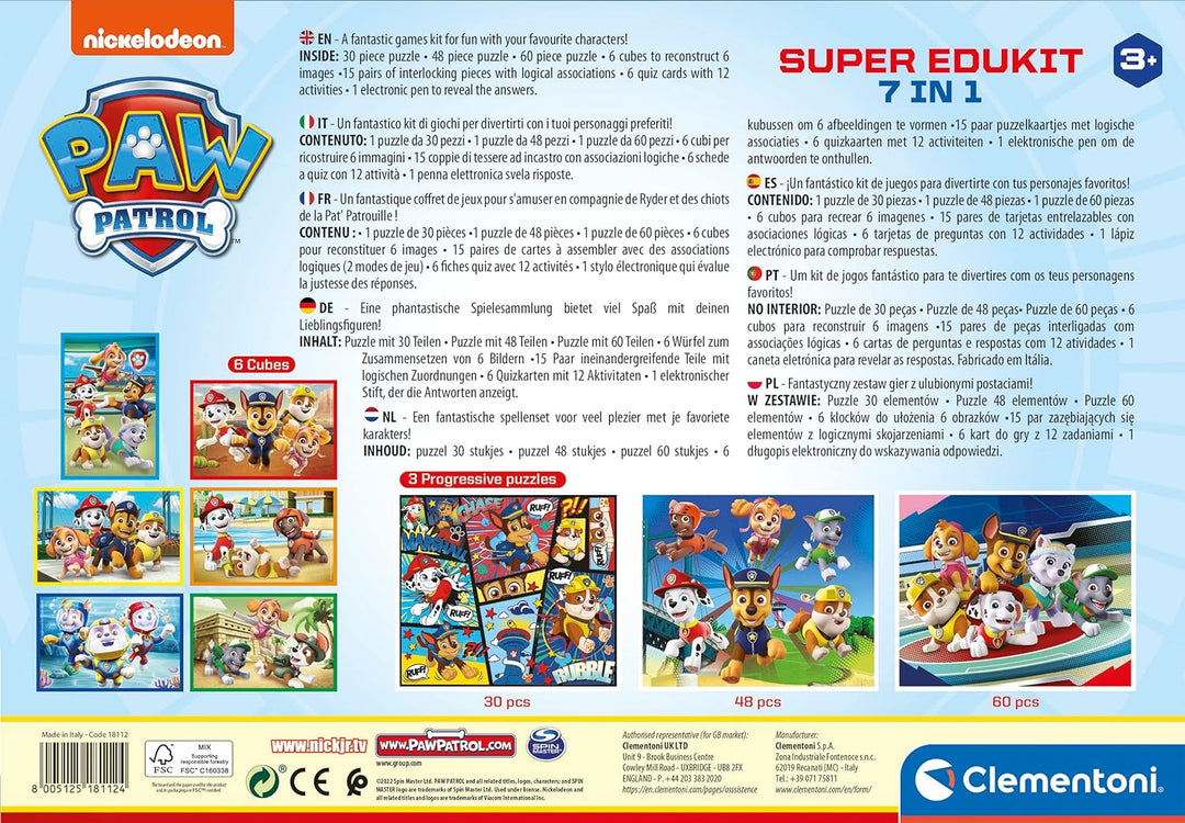PRODUKTBESCHREIBUNGEN PRODUKTBESCHREIBUNG Clementoni - 18112 – Super Edukit 7 in 1 – Paw Patrol (3 Puzzles von 30, 48 und 60 Stück, 6 Würfel, EIN Memo, EIN Domino und 12 Quiz-Karten) – Lernspiel 3 Jahre ie WARNHINWEISE Nicht anwendbar