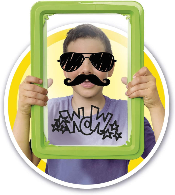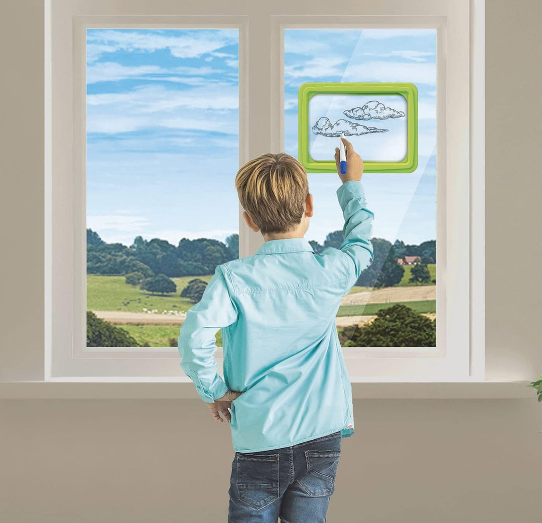 • Malset mit Ständer: Eine niedliche verwandelbare Staffelei, die bei Bedarf zur Tafel mit Saugnäpfen wird, um die Technik des Abdrucks zu testen, indem sie am Fenster platziert wird