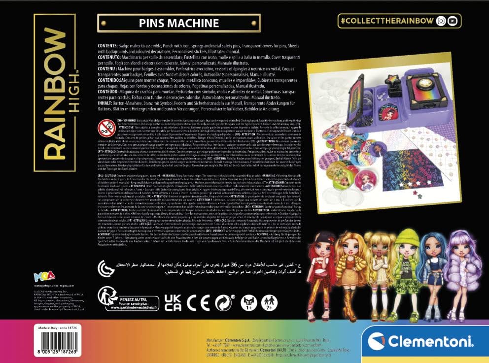 PRODUKTBESCHREIBUNGEN PRODUKTBESCHREIBUNG Clementoni 18726 Rainbow High – Pins Machine – Set zum Erstellen von personalisierten Broschen, kreatives Spiel für Mädchen 7 Jahre – Made in Italy, Mehrfarbig WARNHINWEISE Keine Warnung notwendig