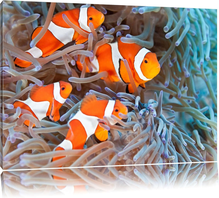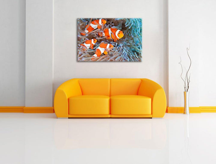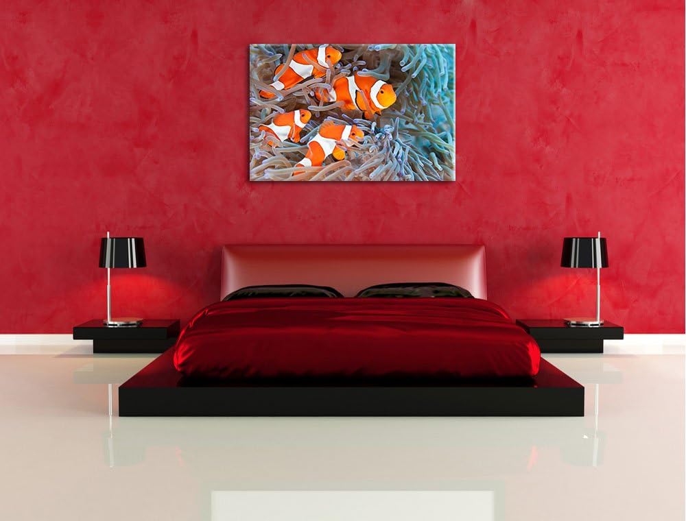 Clownsfische in Anemone Format: 100x70 auf Leinwand, XXL riesige Bilder fertig gerahmt mit Keilrahme