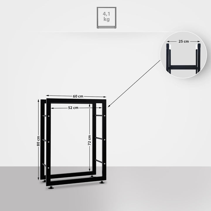 • Das Gestell ist aus schwarzem Metall gefertigt und sehr robust. Durch die schlichte Form und die neutrale Farbgebung lässt sich das Brennholzregal in nahezu alle Wohnräume integrieren.