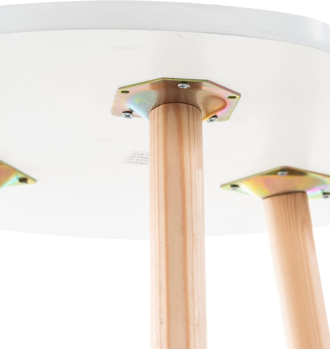 - Die nicht ganz runde Tischplatte ist aus MDF gefertigt und liegt dabei stabil und standsicher auf Beinen aus Buchenholz.