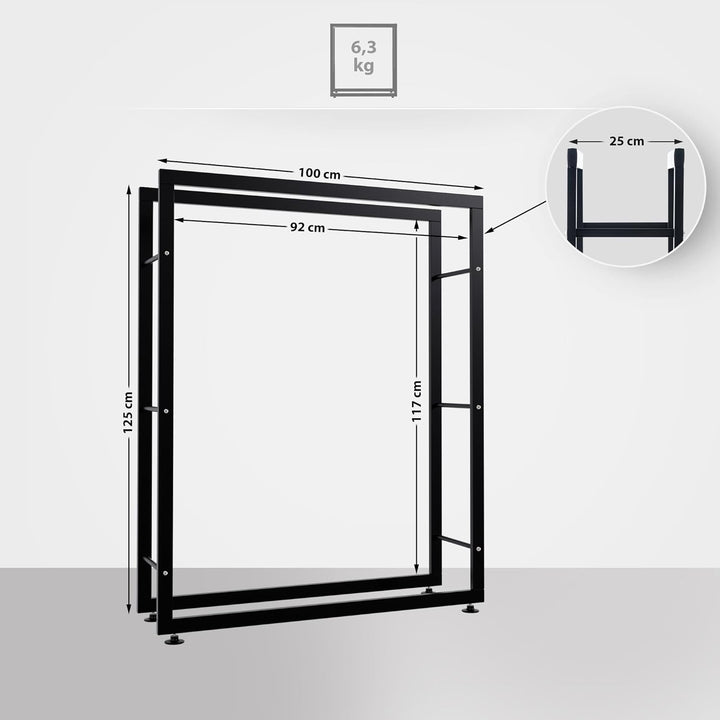 • Das Gestell ist aus schwarzem Metall gefertigt und sehr robust. Durch die schlichte Form und die neutrale Farbgebung lässt sich das Brennholzregal in nahezu alle Wohnräume integrieren.