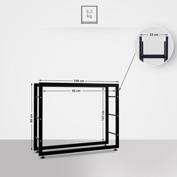 - Das Gestell ist aus schwarzem Metall gefertigt und sehr robust. Durch die schlichte Form und die neutrale Farbgebung lässt sich das Brennholzregal in nahezu alle Wohnräume integrieren.