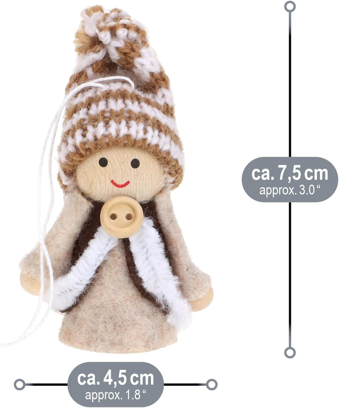 - LIEFERUMFANG: 12x Weihnachtsfiguren (mit Anhänger in komfortabler Schachtel) // Dekoration: 4x Stern, 4x Schneeflocke, 8x Knopf // Material: 100% Polyester, Polystyrol, Wolle, Holz // Masse: ca. 4,5 x 7,5 x 3 cm (Breite x Höhe x Tiefe)