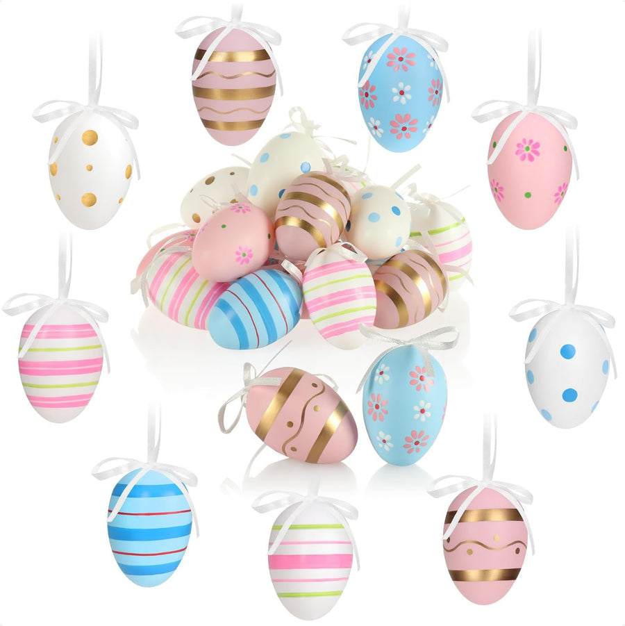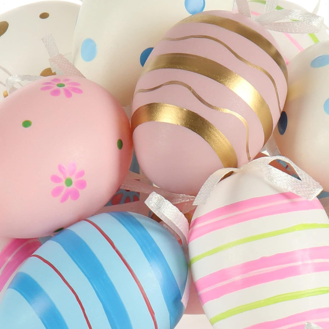 - LIEFERUMFANG: 18x Ostereier // Masse: ca. 5,5 cm (Länge) // Material: Kunststoff, Seidenband // Farbe: rosa, blau, grün, weiss, goldfarben