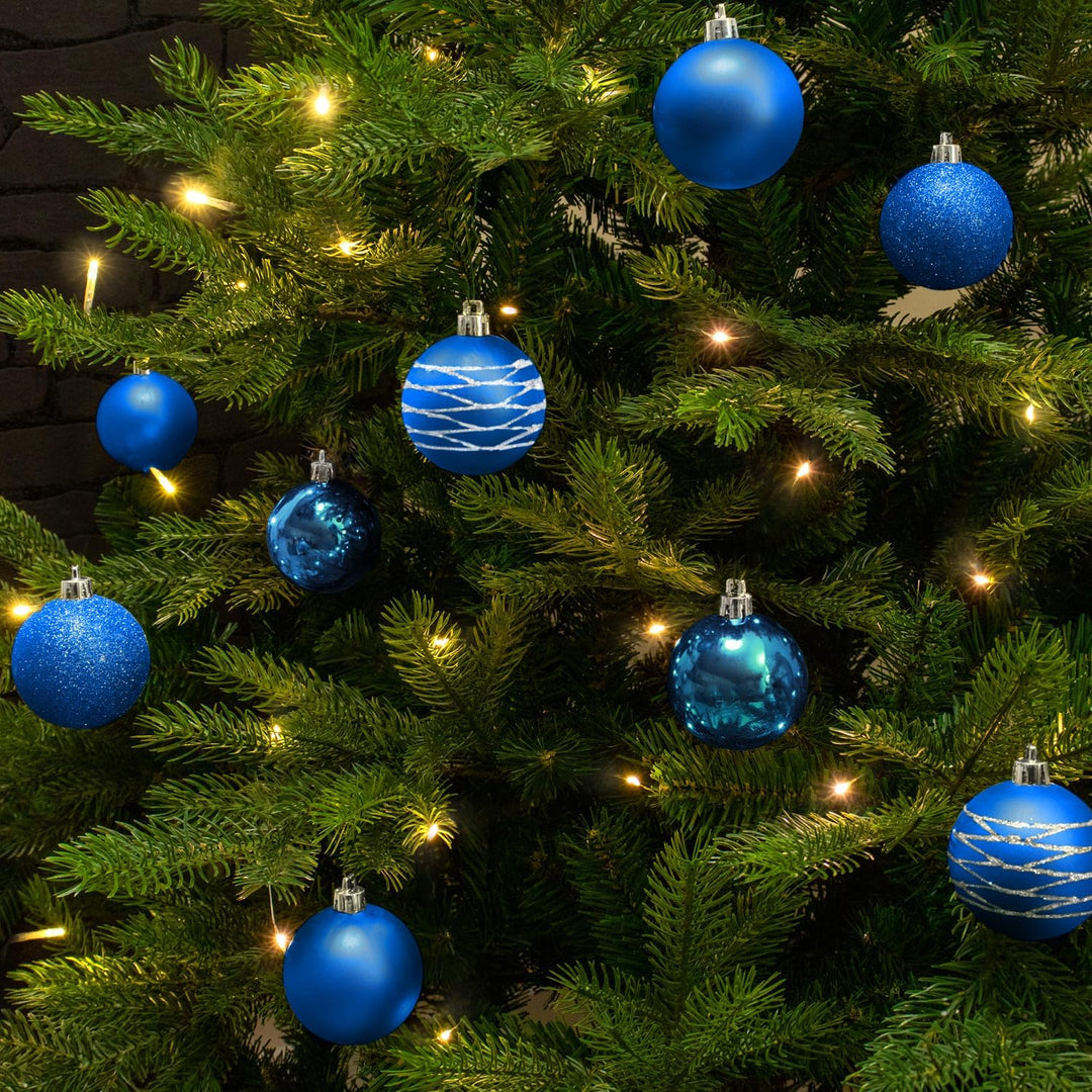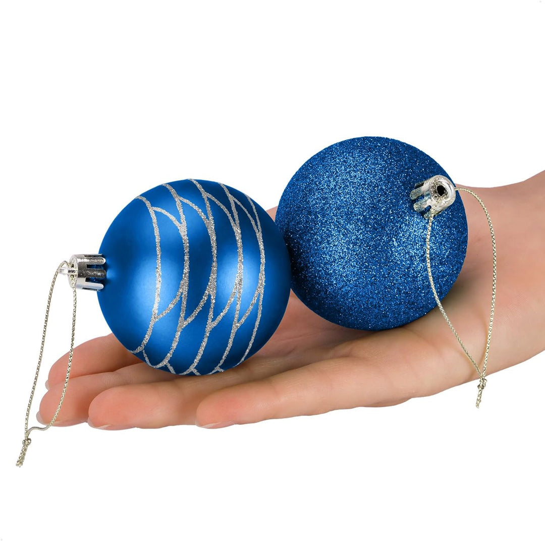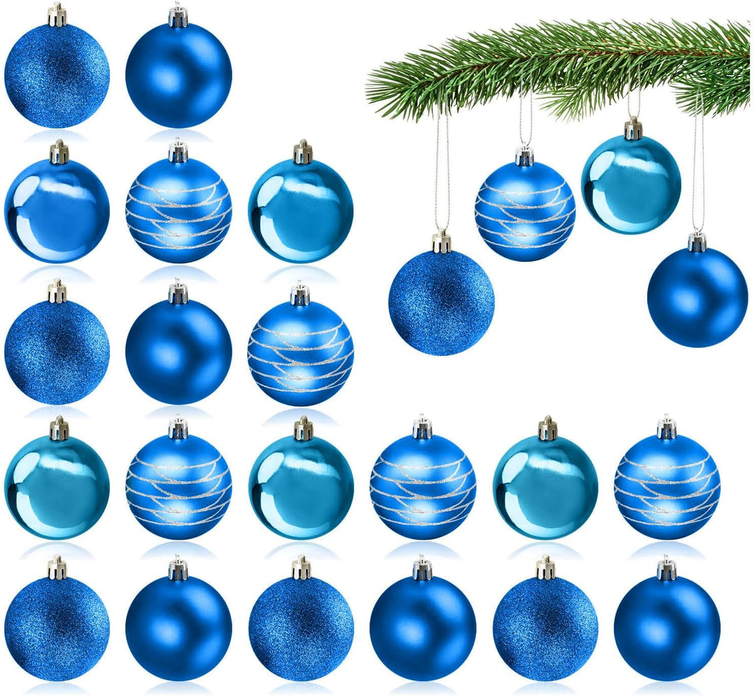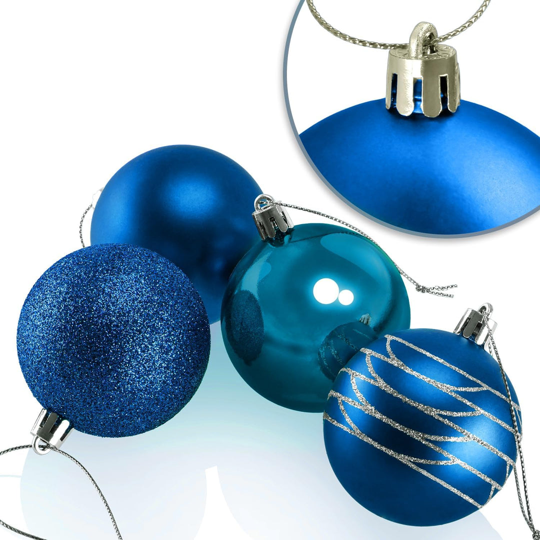 - LIEFERUMFANG: 20x Kugeln (Mit Aufhänger) Farbe: blau, 5x matt, 5x glänzend, 5x matt mit Glitzer, 5x Glitzer // Material: Kunststoff // Masse: Ø 6 cm