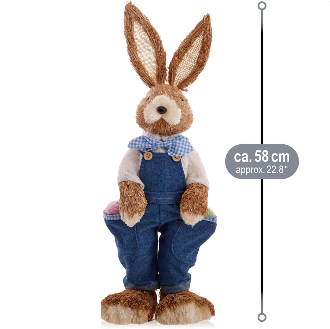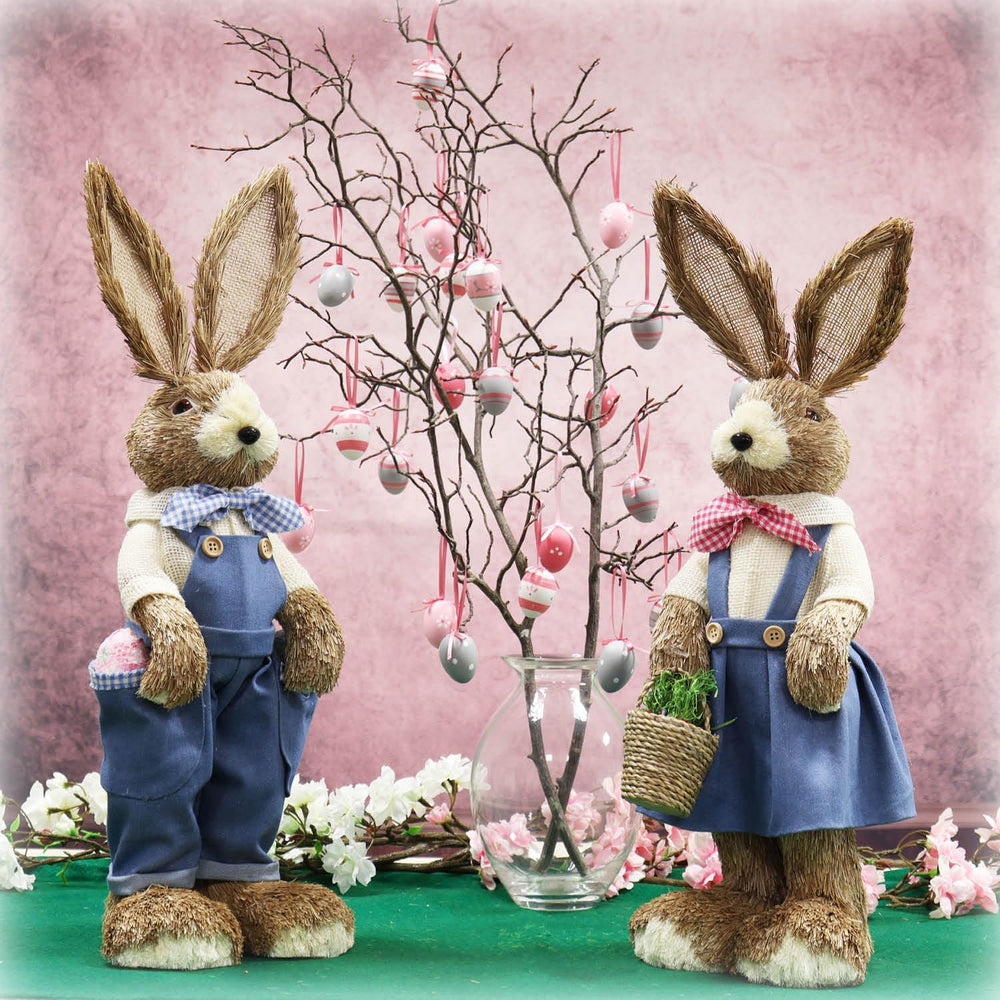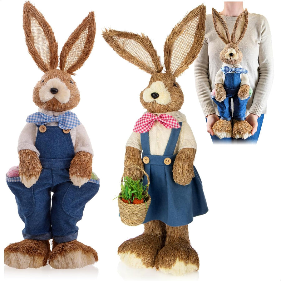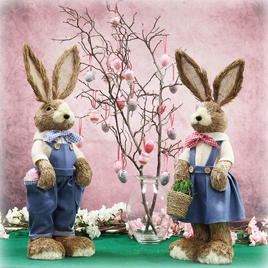 • LIEFERUMFANG: 2x Deko-Osterhase // Material: Stroh, Holz, Styropor, Kunststoff // Farbe Kleidung: weiss/rot/grün kariert // Masse: ca. 33 cm (Höhe)