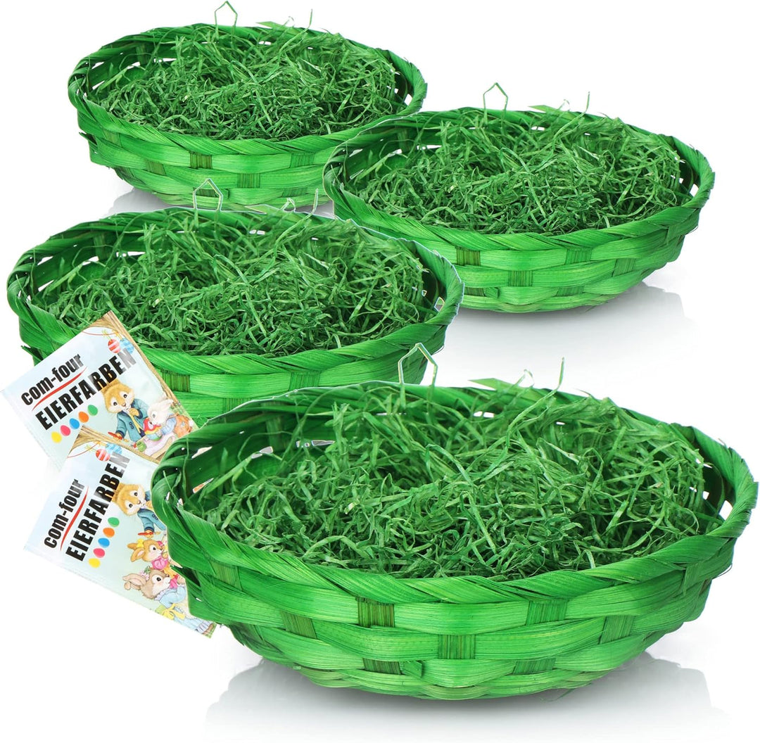 - LIEFERUMFANG: 4x Deko-Körbe, ca. 100g Ostergras, 10x Eierfarbe (2x je Farbe) // Material: Holzwolle, Bast, Lebensmittelfarbstoffe // Masse je Korb: ca. 22,5 x 7,5 cm (Ø x Höhe) // Farbe: grün // Eierfarben: gelb, orange, rot, grün, blau