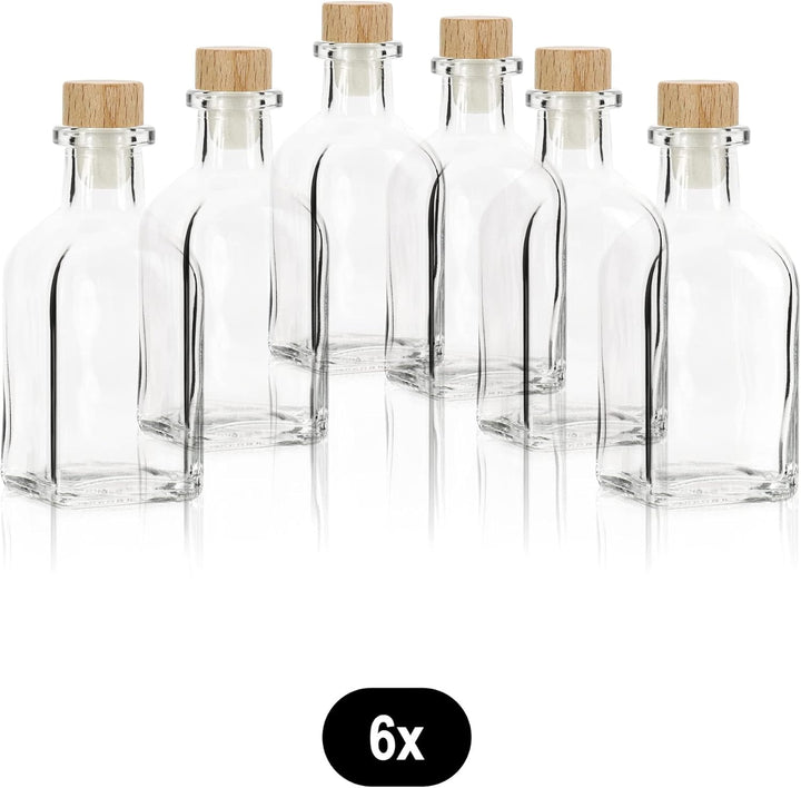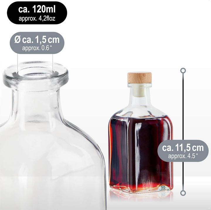 - LIEFERUMFANG: 6x Glasflasche mit Korken // Masse: ca. 11,5 x 5 x 5 cm (Höhe x Breite x Tiefe) // Flaschenöffnung: Ø ca. 1,5 cm // Volumen: ca. 120 ml // Empfohlene Füllmenge: ca. 110 ml // Material: Glas, Holz, Kunststoff // Farbe: transparent, braun