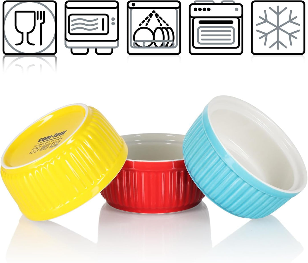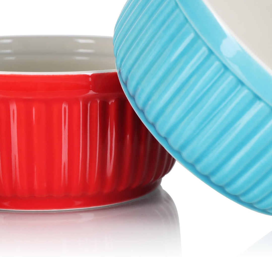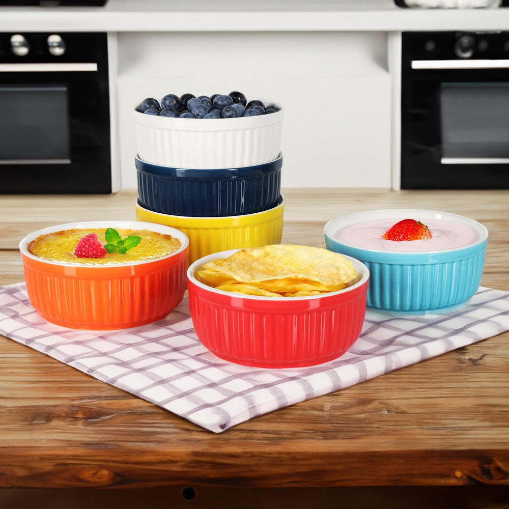 - LIEFERUMFANG: 6x Souffléförmchen // Masse: ca. 5 x 11 cm (Höhe x Ø) // Füllmenge je Schale: ca. 250 ml // Material: Keramik // Farbe: weiss, hellblau, dunkelblau, gelb, orange, rot // Ofenfest // Mikrowellengeeignet // Spülmaschinengeeignet