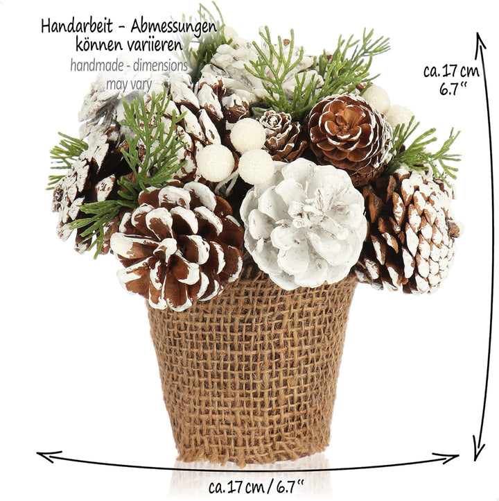 - LIEFERUMFANG: 1x Weihnachtsgesteck // Farbe: grün, weiss, braun, silberfarben // Masse: ca. 17 x 17 x 17 cm (Länge x Breite x Höhe) // Material: Zapfen, Zweige, Jute, Styropor, Kunststoff, Metall