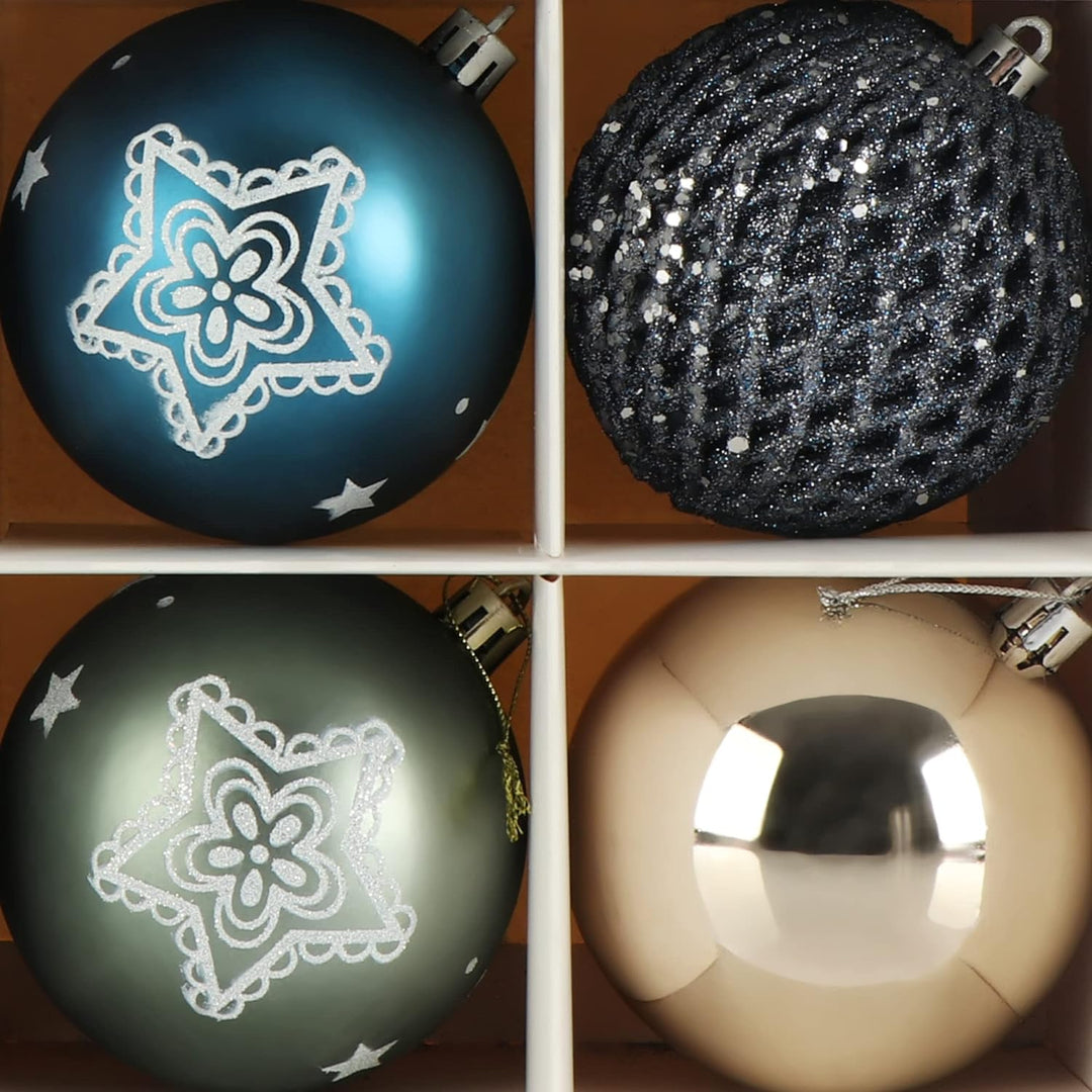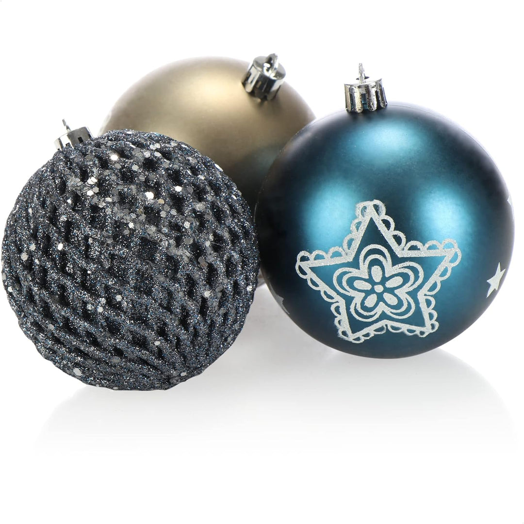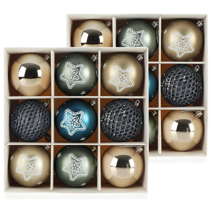 - LIEFERUMFANG: 18x Kugeln // Material: Kunststoff // Masse: ca. 8 cm Ø // Farbe: blau, grau, champagnerfarben