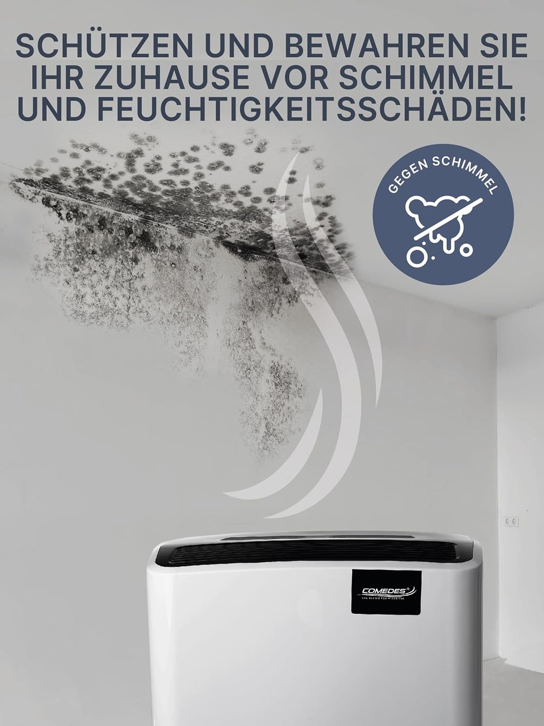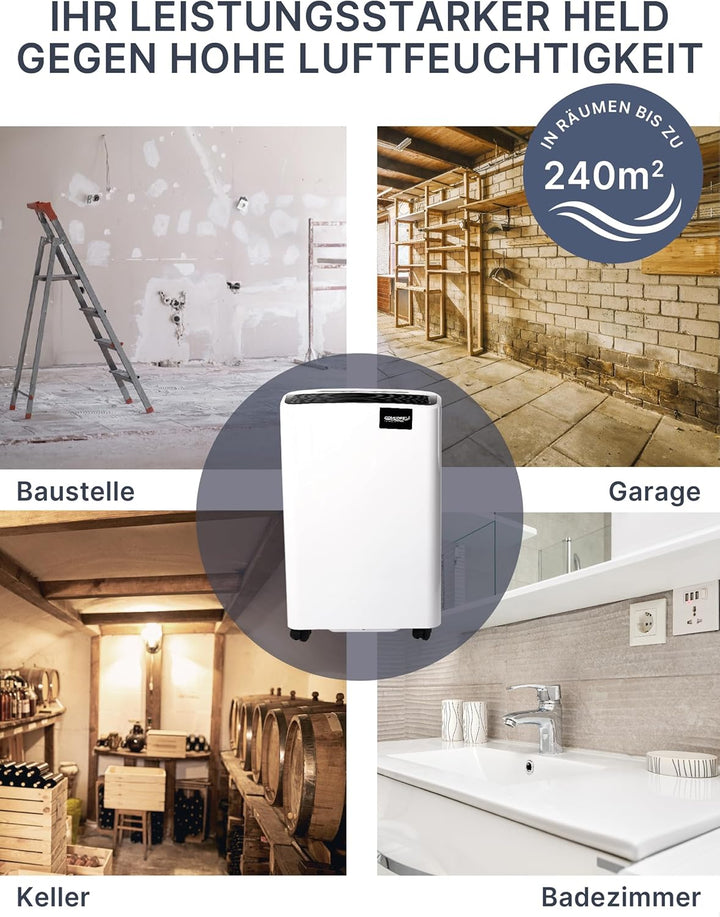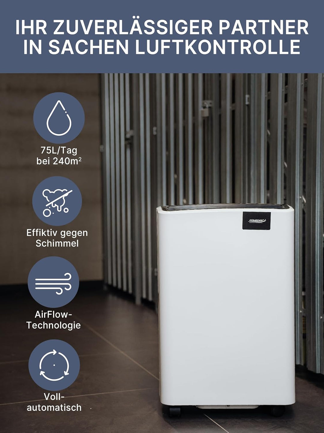 - LEISTUNGSSTARK– Der Entfeuchter arbeitet in Räumen bis zu 240m² und mit einer Entfeuchtungsleistung bis zu 75 l Wasser pro Tag und sorgt immer für ein gutes Raumklima und vermeidet somit proaktiv Schimmelbildung.