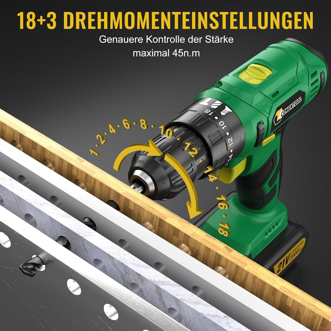 - 【45N.m Max Drehmoment und 18+3 Drehmomenteinstellung】 - Der 21V akkubohrschrauber bietet ein maximales Drehmoment von 45N.m und die 18+3 Drehmomenteinstellung ermöglicht Ihnen ein präzises Arbeiten. Die akku schlagbohrschrauber integrierte