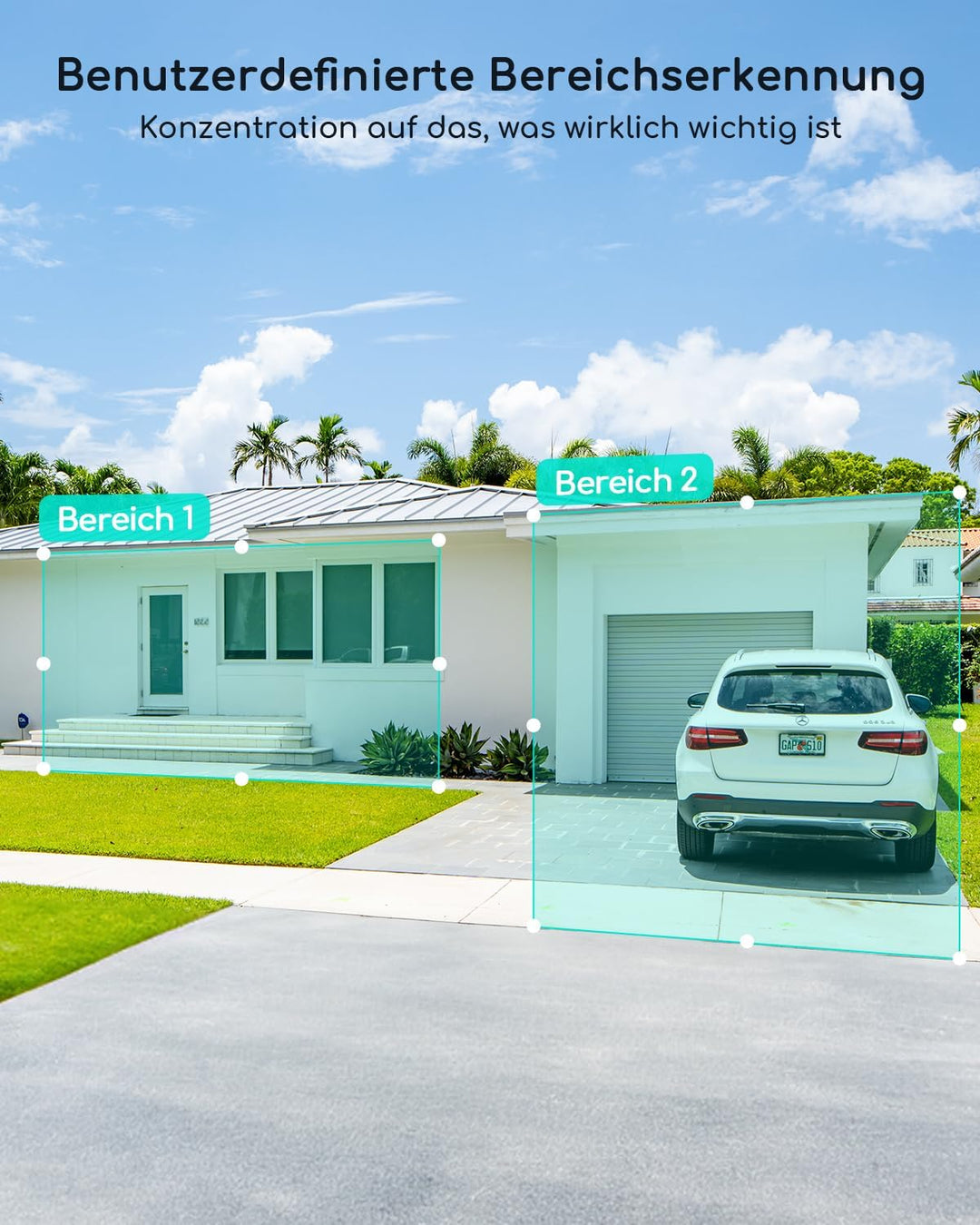 • 【2K-Auflösung und Farbnachtsicht】 Diese Überwachungskamera für den Aussenbereich verfügt über eine 2K-Auflösung, die Tag und Nacht klarere Bilder als 1080P liefern kann. Die aktualisierte Version der Aussenkamera ist mit einem weissen Licht