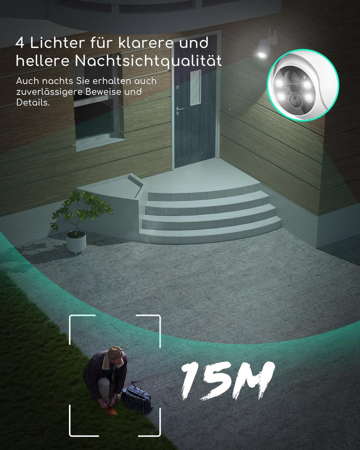 - 【Hervorragender 4-Licht-Nachtsicht】Das Sicherheitskamera-Upgrade ist mit 4 LEDs ausgestattet, die einen klareren und helleren Nachtsichteffekt als andere ähnliche Batteriekameras bieten, sodass Sie auch nachts ein klares Vollfarbbild sehen