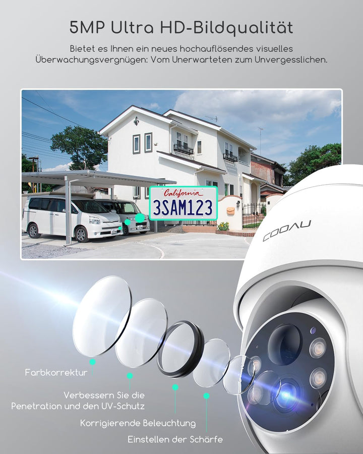 - 【5MP Super HD + 360° Betrachtungswinkel】 Marktführende 5-Megapixel-Hochauflösung! Im Vergleich zu herkömmlichen 1080P/3MP-Kameras können breitere und klarere Bilder aufgenommen werden(2592*1944P).Diese überwachungskamera aussen solar