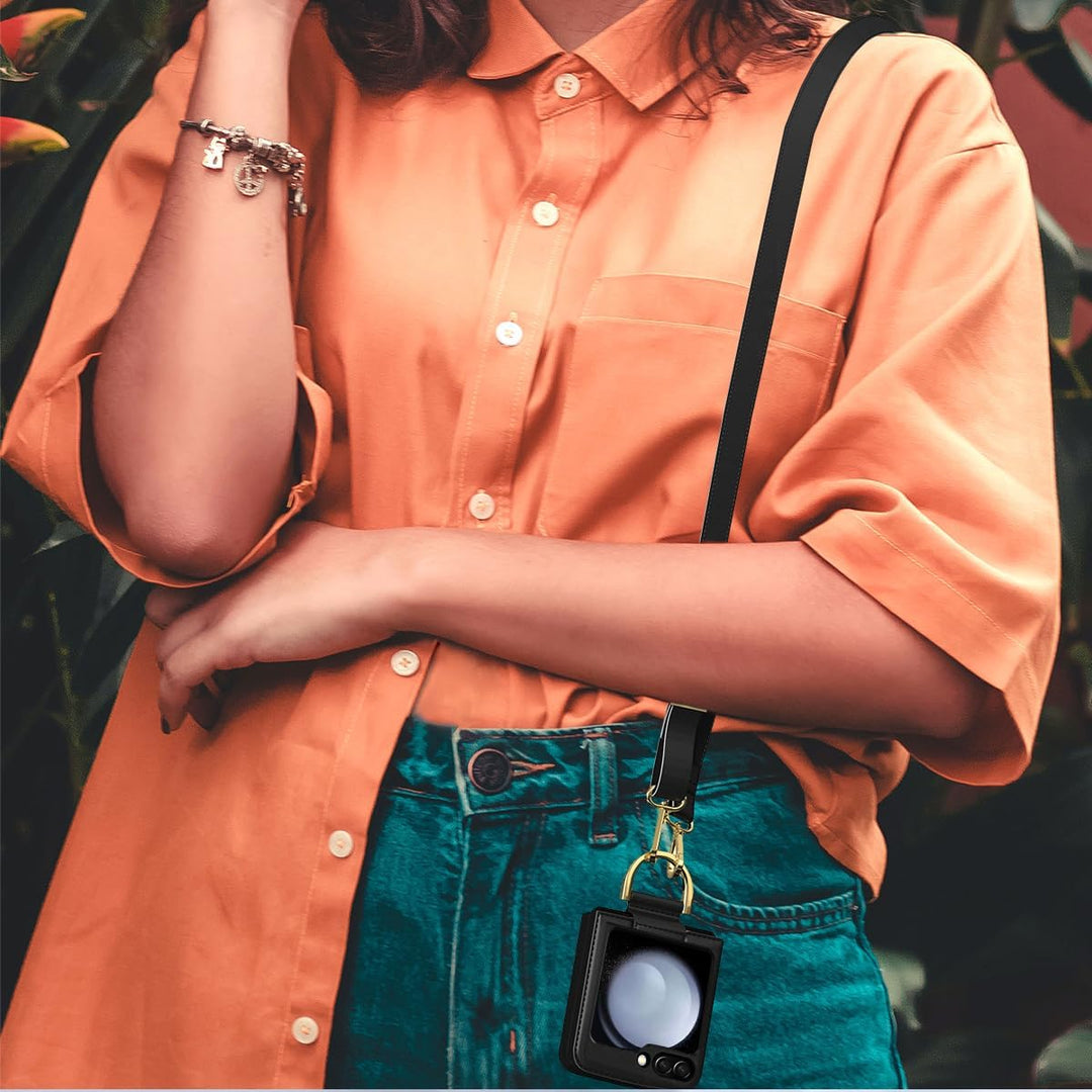 - Handgemachter Schultergurt des dünnen Ledermetallrings Schutzhülle für Samsung Galaxy Z Flip 5 5G-Handy. Handyhülle wird in Sekunden zu einer exquisiten kleinen Tasche.