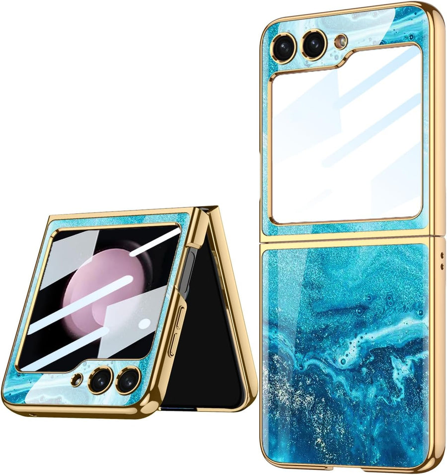 - Vergoldeter Rahmen, 9H, gehärtetes Glas, helle Farbe, Telefonhülle mit externem Displayschutz für Samsung Galaxy Z Flip 5 5G Telefon.