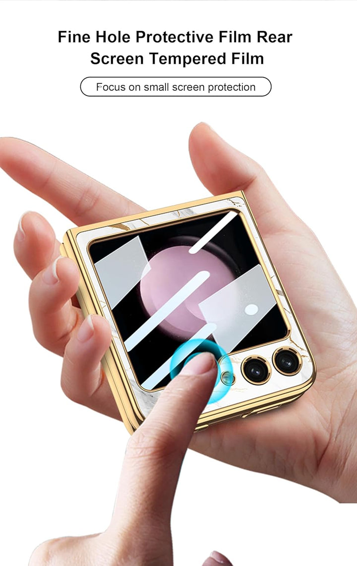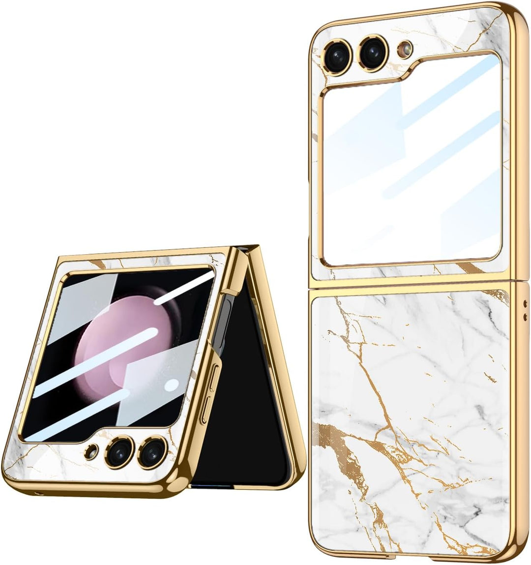 - Vergoldeter Rahmen, 9H, gehärtetes Glas, helle Farbe, Telefonhülle mit externem Displayschutz für Samsung Galaxy Z Flip 5 5G Telefon.