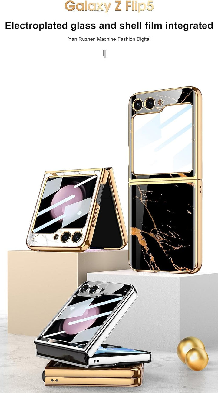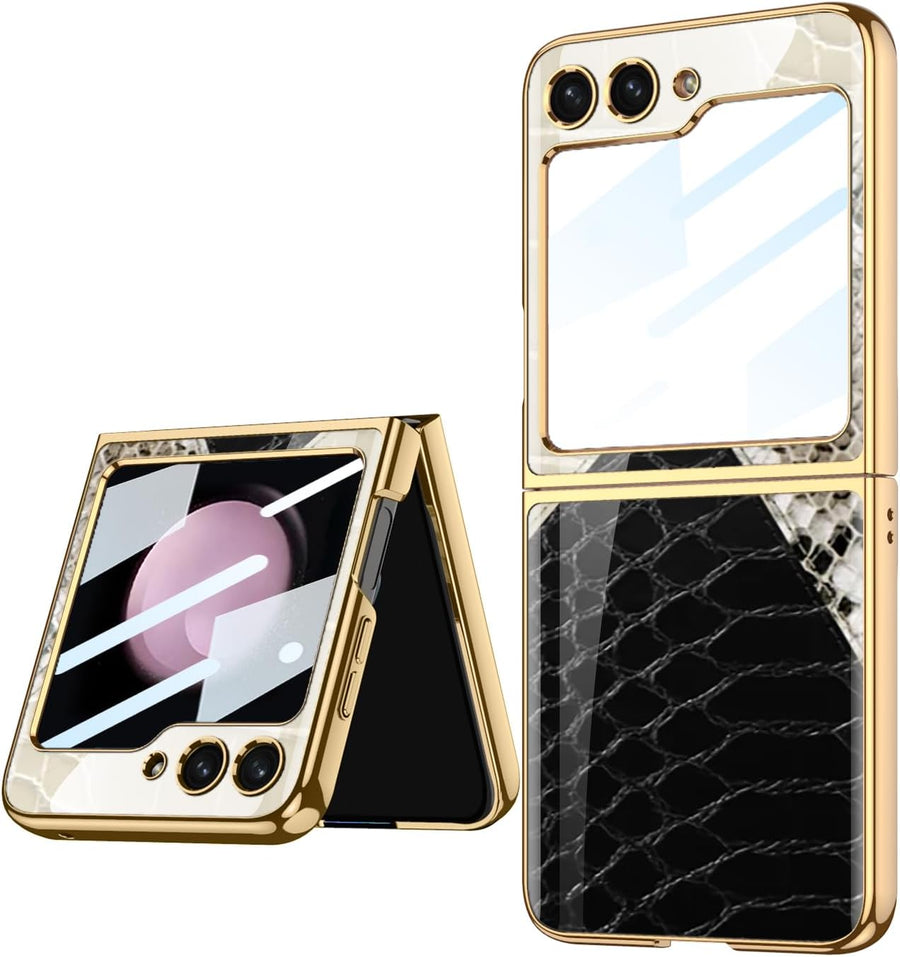 - Vergoldeter Rahmen, 9H, gehärtetes Glas, helle Farbe, Telefonhülle mit externem Displayschutz für Samsung Galaxy Z Flip 5 5G Telefon.