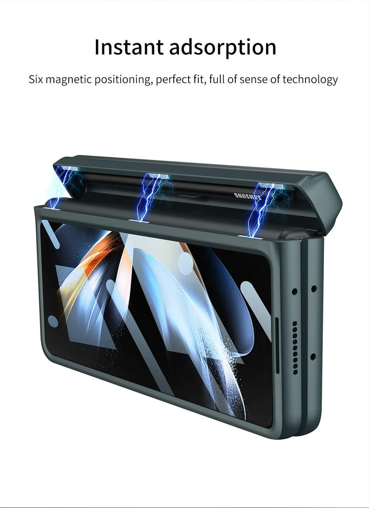 - Die Samsung Galaxy Z Fold 4 5G-Hülle verfügt über sechs magnetische Positionierungen für sofortige Adsorption, perfekte Passform, voller Technologie und wird mit einer hochauflösenden Schutzfolie aus gehärtetem Glas geliefert.