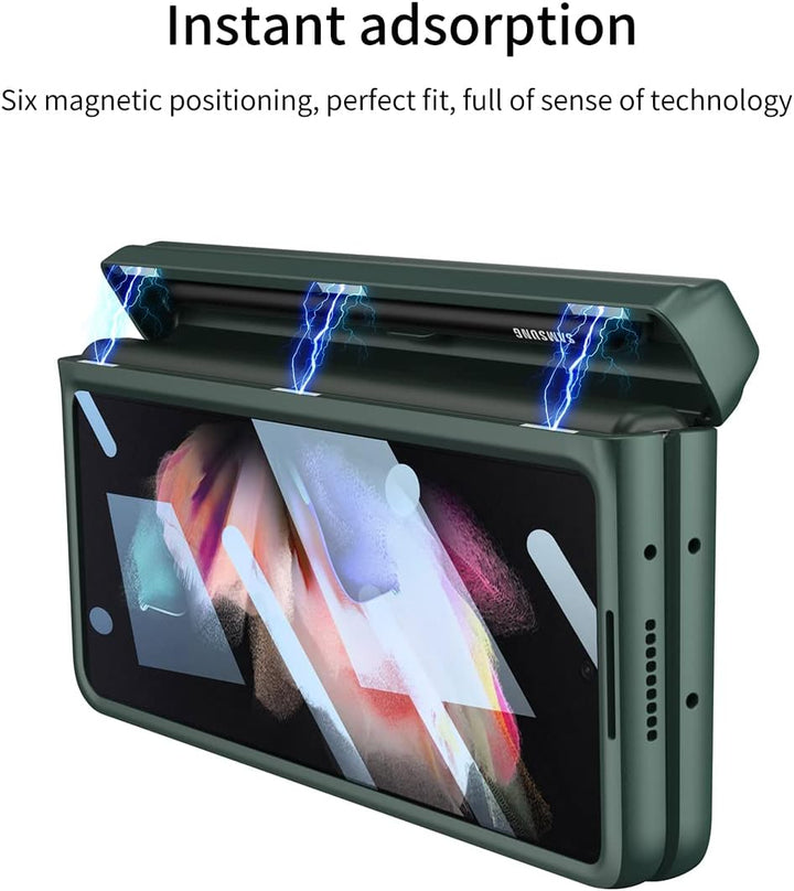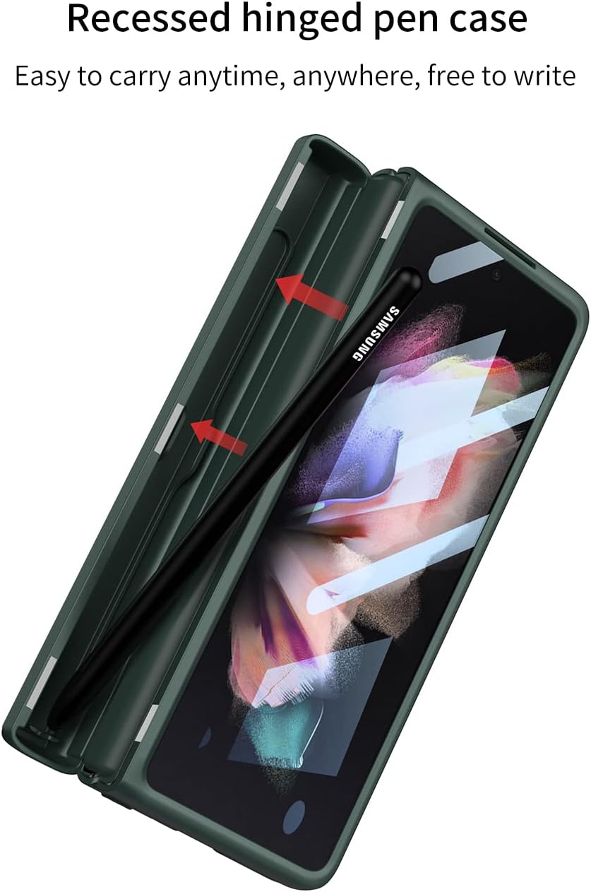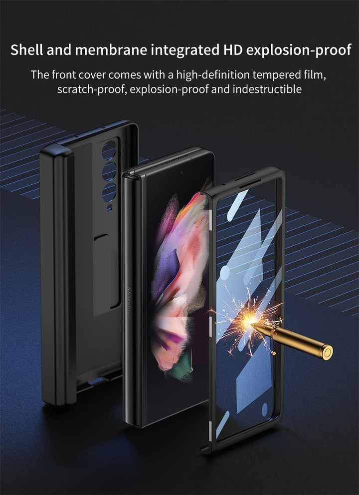 - Die Handyhülle wird mit einer eigenen Displayschutzfolie aus gehärtetem Glas und einem integrierten unsichtbaren Stylus-Steckplatz geliefert, der speziell für das Samsung Galaxy Z Fold 3 5G-Telefon entwickelt wurde.