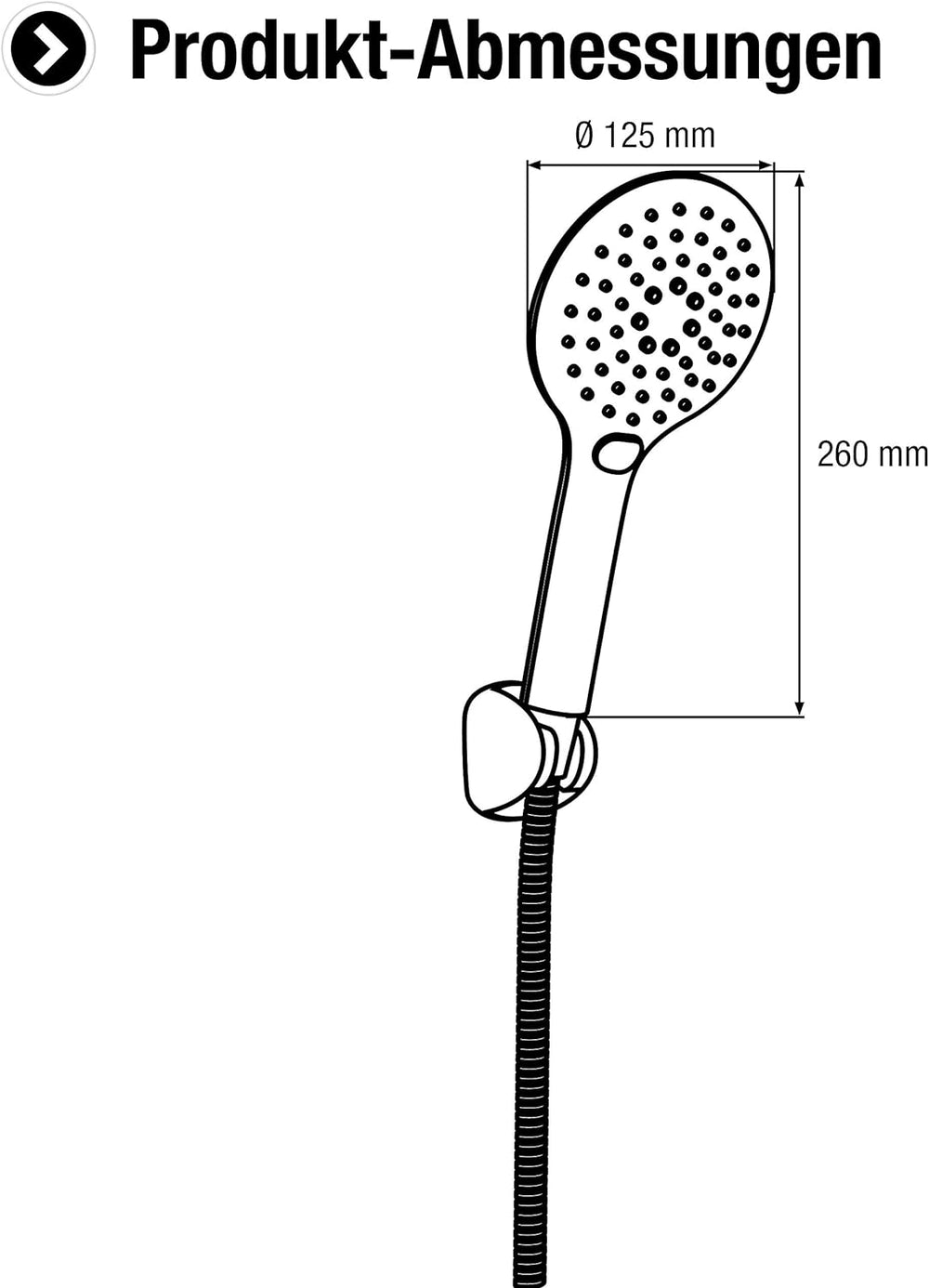 - PRODUKT-DETAILS: Brauseschlauch-Länge: 150 cm | Kopf-Grösse: Ø 125 mm | Anzahl Strahlarten: 3 | Durchflussmenge: 5, 1 l/min (3 bar) | Durchflussmenge (mit Wasserspareinsatz): 3, 7 l/min (3 bar) | Wassereinsparung: 30 %