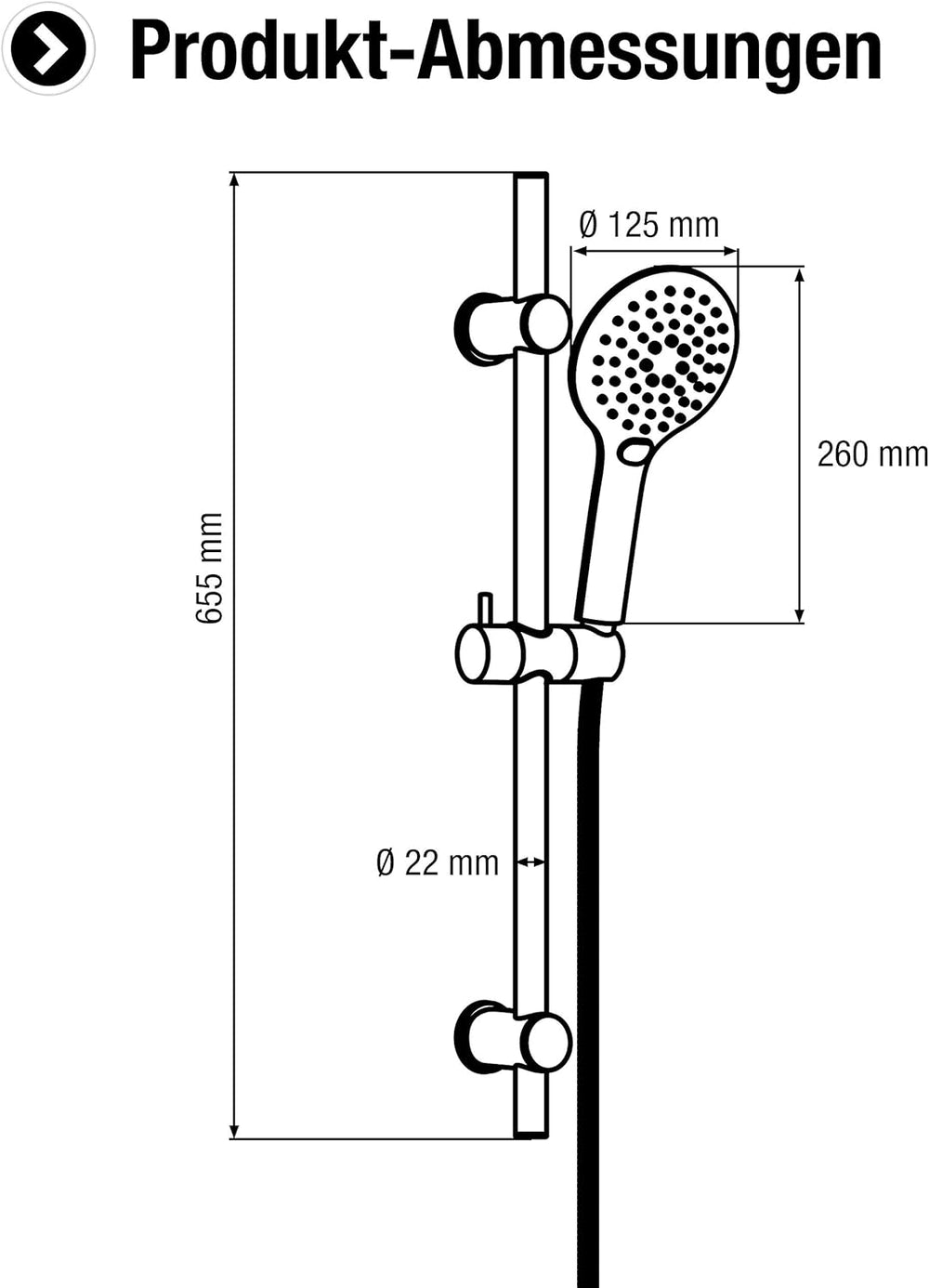 - PRODUKT-DETAILS: Brauseschlauch-Länge: 150 cm | Kopf-Grösse: Ø 125 mm | Anzahl Strahlarten: 3 | Durchflussmenge: 5,1 l/min (3 bar) | Durchflussmenge (mit Wasserspareinsatz): 3,7 l/min (3 bar) | Wassereinsparung: 30 Prozent