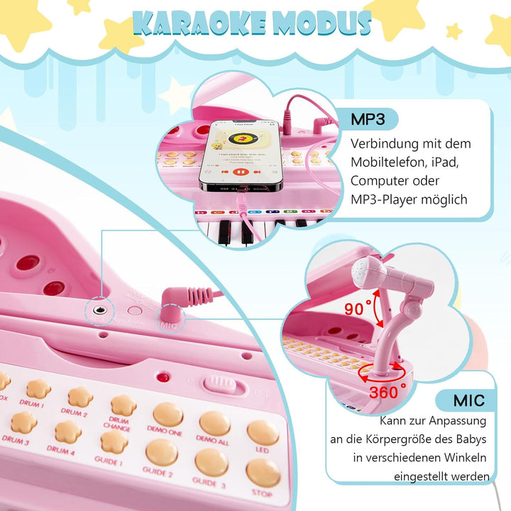 - 🎹【Funktioneller Karaoke-Modus】Mit dem Mikrofon können Kinder das Singen üben, während sie Klavier spielen. Die MP3-Schnittstelle kann mit dem Mobiltelefon oder MP3-Player verbunden werden. Gleichzeitig wird die MIC-Schnittstelle mit dem