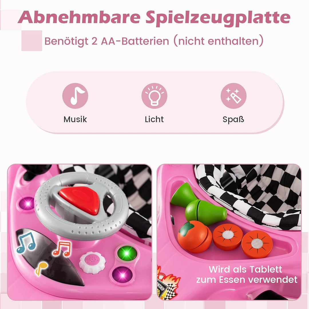 - đ”ăInteraktive FunktionenăDieser Lauflernwagen im Rennwagendesign verfĂŒgt ĂŒber RĂŒckspiegel, Lenkrad und Hupe, Schalthebel und dekorative RĂ€der, die Kinder zum Erkunden ermutigen. Das Musiktablett mit Lichtern und Lautsprecher kann die auditiven