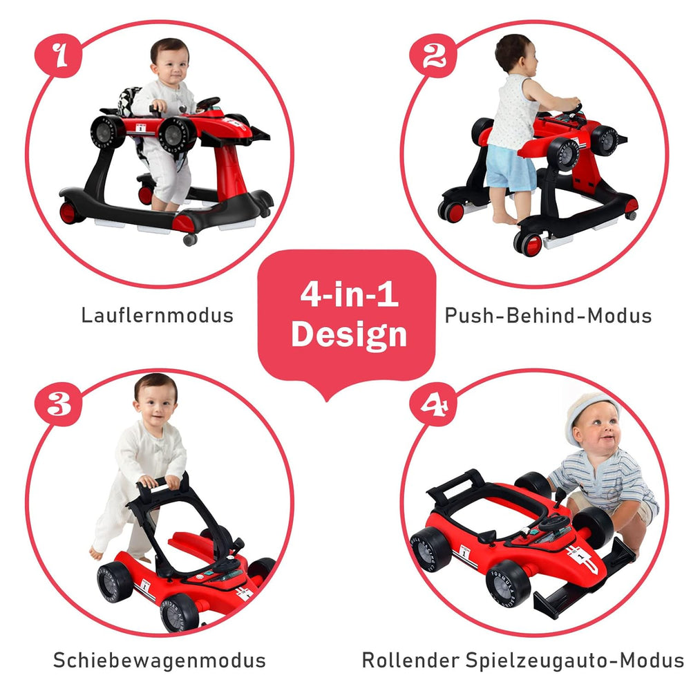 - đă4 in 1 MultifunktionenăDie Lauflernhilfe hat ein 4 in 1 Design, nĂ€mlich Lauflernmodus, Push-Behind-Modus, Schiebewagenmodus und Babykart-Modus, durch die verschiedenste BedĂŒrfnisse der Kinder erfĂŒllt werden können. Sie eignet sich fĂŒr Kinder von 6 bis 18 Monaten und kann Maximalgewicht von 11kg tragen.