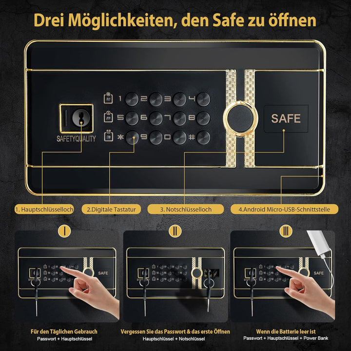 - 【Duales Alarmsystem & 2 Stromversorgungsmöglichkeiten】Dieser Tresor ist mit einem dualen Alarmsystem ausgestattet. Ton- und Lichtalarm werden ausgegeben, wenn der Dieb dreimal ein falsches Passwort eingibt oder der Safe heftig getroffen wird. Der