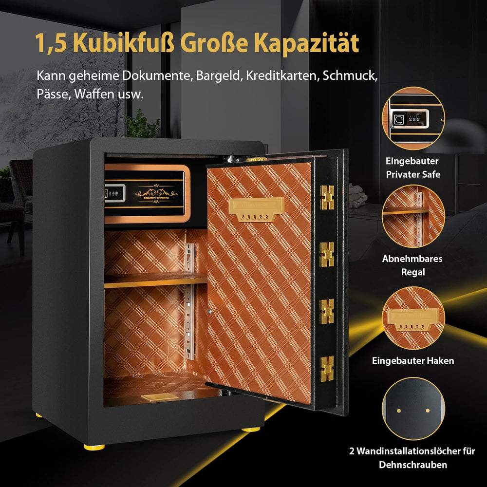 - 【Viel Stauraum】Die Masse des Tresors betragen 36,5 x 37,5 x 59 cm (L x B x H). Mit einem grossen Fassungsvermögen von 42,5 L können Sie problemlos alle Ihre Wertsachen wie Geheimdokumente, Bargeld, Kreditkarten, Schmuck, Reisepässe, usw.