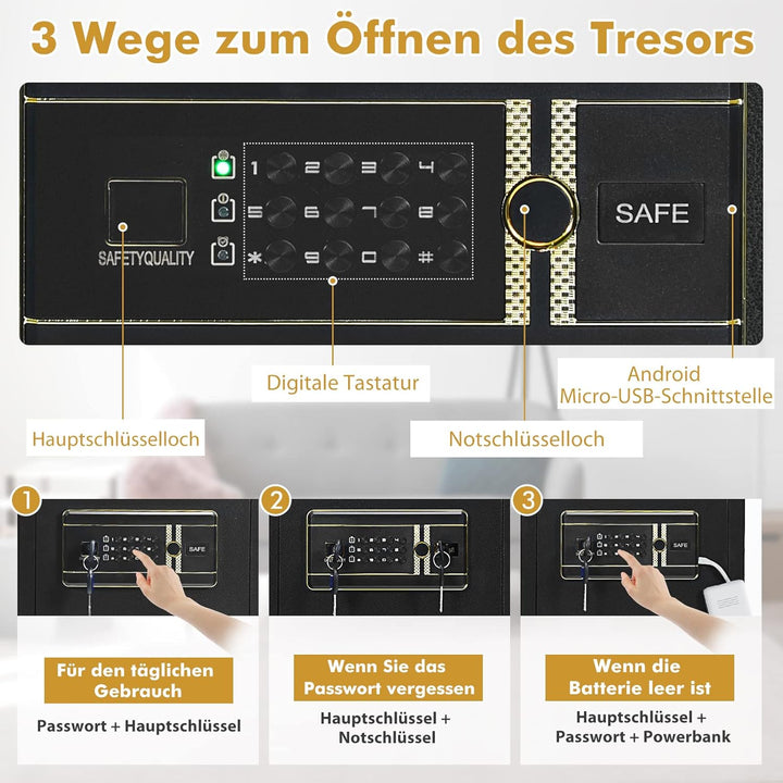 - đă3 ĂffnungsoptionenăDieser elektronische Tresor wird mit 2 Master-SchlĂŒsseln, 2 NotfallschlĂŒsseln und einer Android Micro-USB-Schnittstelle geliefert. Im Alltag mĂŒssen Sie einfach den Code eingeben und den Master-SchlĂŒssel verwenden. Wenn Sie den Code vergessen, können Sie beide SchlĂŒssel zusammen verwenden. Sollte der Akku leer sein, mĂŒssen Sie ein LadegerĂ€t, Master-SchlĂŒssel und den Code verwenden.