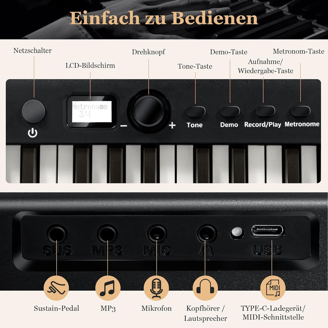 - 【Einfaches Aufladen und doppelte drahtlose Verbindung】Unsere elektrisches Keyboard mit eingebautem 1750-mAh-Akku kann mit einem 5-V-1-A-Netzteil aufgeladen werden. Darüber hinaus kann das Keyboard mit 5 externen Anschlüssen (einschliesslich USB /