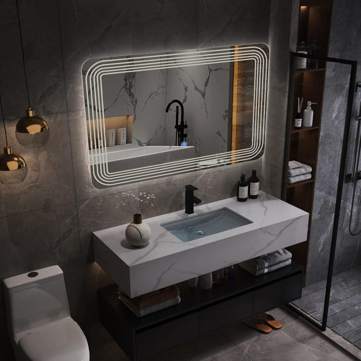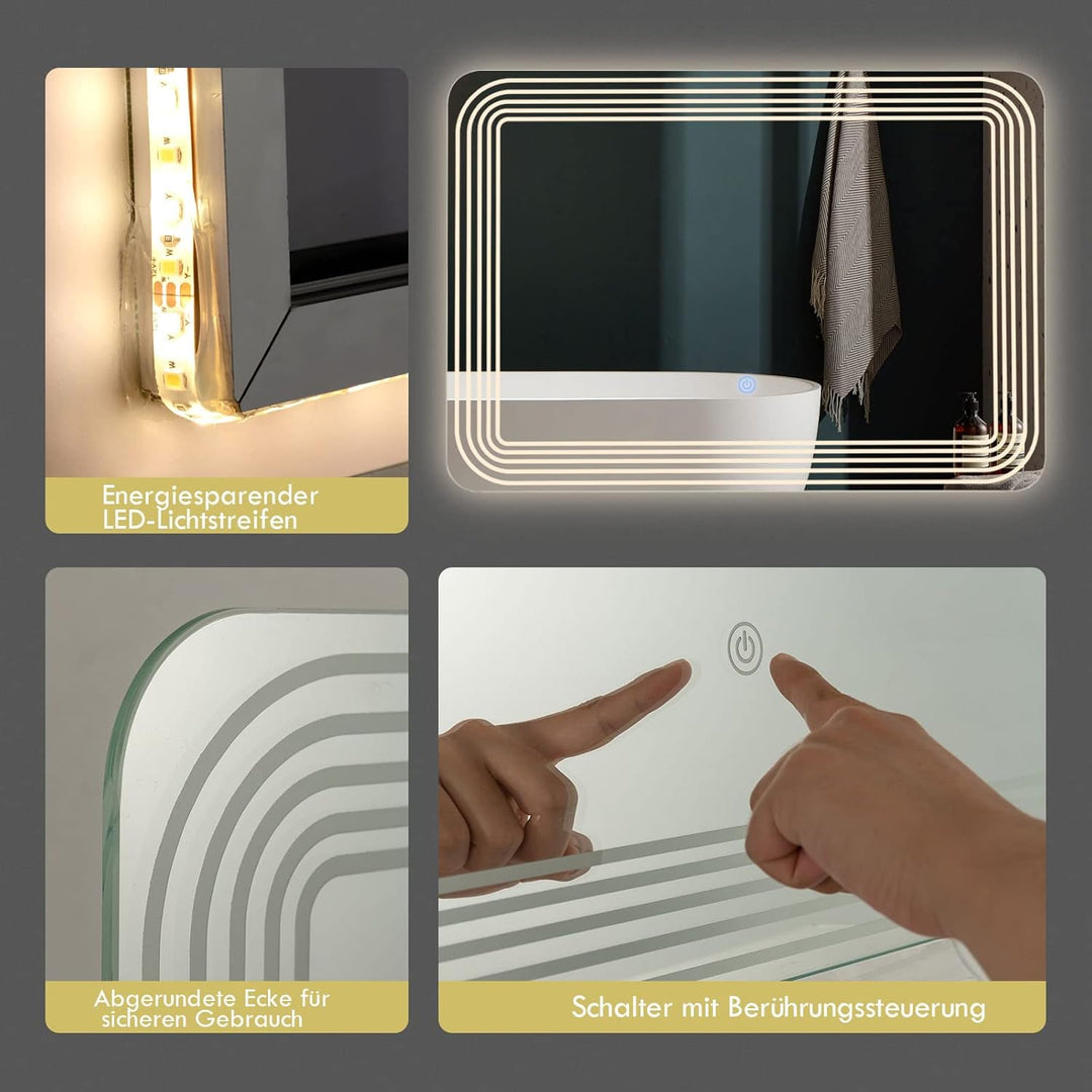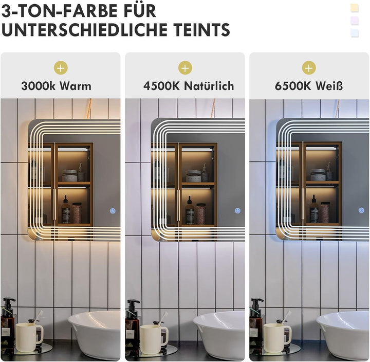 - 【Dimmbar und 3 Farbeinstellungen】Unser LED-Badezimmerspiegel bietet 3 Lichttemperaturen – 3000 K warmes Licht, 4500 K neutrales Licht und 6500 K kaltes Weiss. Drücken Sie lange auf den Berührungsschalter, um die Lichtintensität von 10 % bis 100