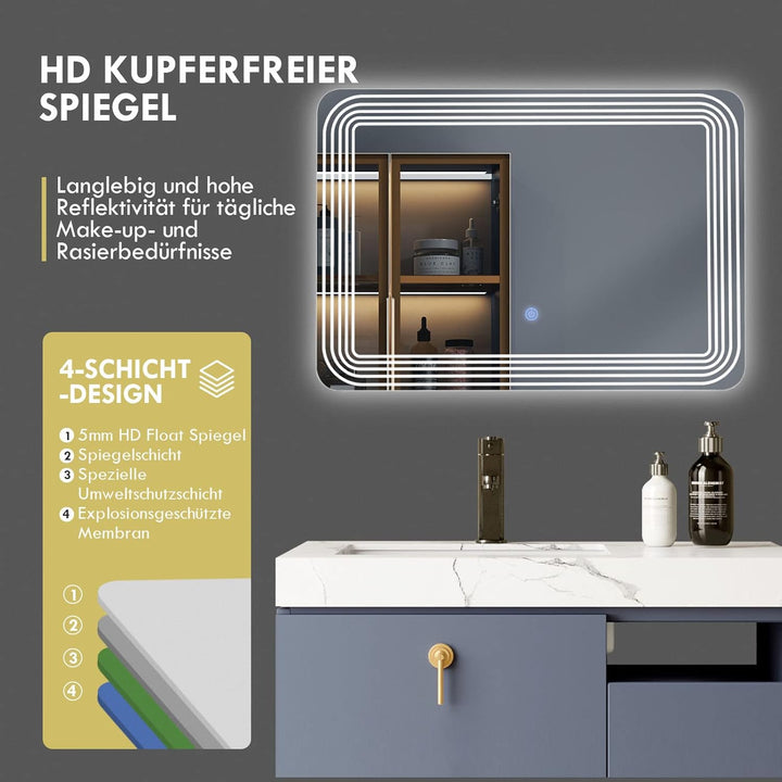 - 【Kupferfreier HD-Spiegel】Durch die Verwendung des kupferfreien Materials hat dieser Spiegel im Vergleich zu den üblichen silberbeschichteten Spiegeln eine verbesserte Qualität und Haltbarkeit. Unser LED-Badezimmerspiegel wurde mit 4 Schichten