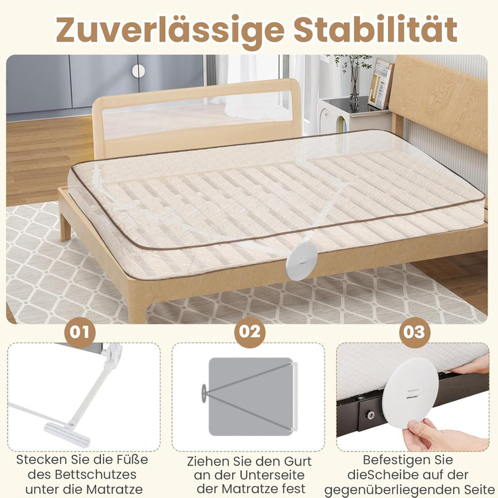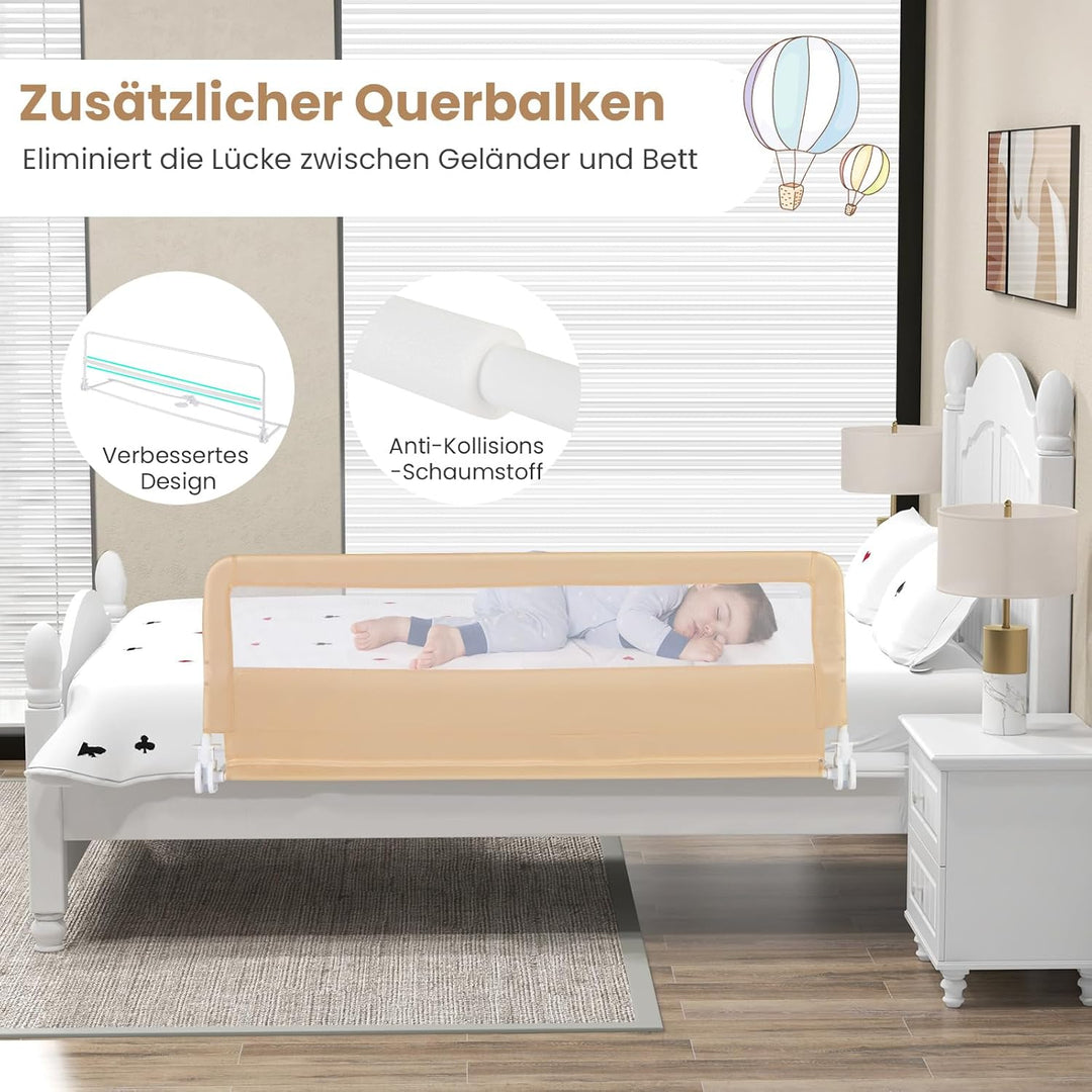 • 【Erhöhte Sicherheit】Das 150 cm lange Bettgitter verfügt über eine zusätzliche Querstrebe, die mit Anti-Kollisionsschaum umwickelt ist, um die Lücke zwischen Gitter und Bett zu beseitigen und Ihr Kind die ganze Nacht sicher zu halten. Das sichere