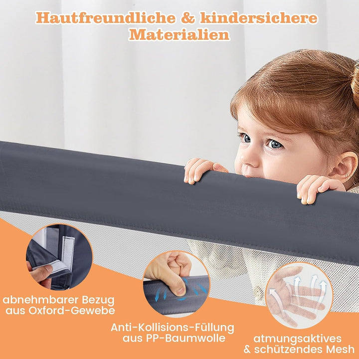 - 【Detailorientiertes Design】 Unser Bettgitter weist eine glatte Oberfläche und vollkommen abgerundete Ecken auf, um die Haut Ihres Kindes vor Verletzungen zu schützen. Das Meshgewebe ermöglicht zudem eine gute Luftzirkulation und hilft Ihnen, Ihr Baby jederzeit im Auge zu behalten und seine Bewegungen zu beobachten. Zudem lässt sich das Schutzgitter leicht auseinanderbauen und reinigen.