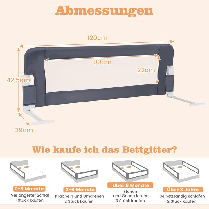 - 【Schützen Sie Ihr Baby】 Mit einer Länge von 105/120/150 cm garantiert dieses Bettgitter Ihrem Kind eine herausragende Sicherheit. Wenn Ihr Kind nachts allein schläft, bietet ihm dieses Gitter den besten Schutz und eine sichere Umgebung. Dank dieses Schutzgitters müssen Sie sich keine Sorgen machen, dass Ihr Baby aus dem Bett fallen könnte.