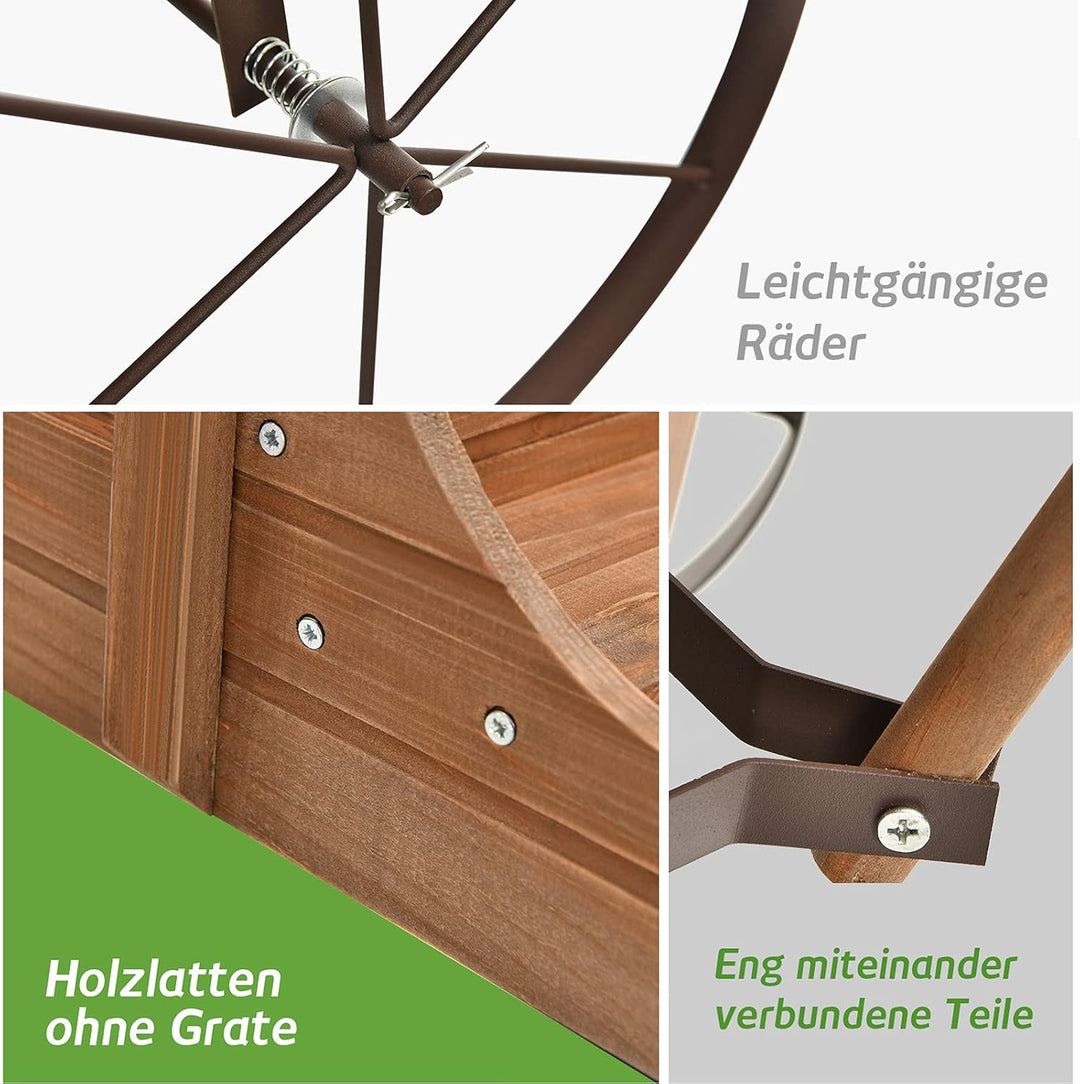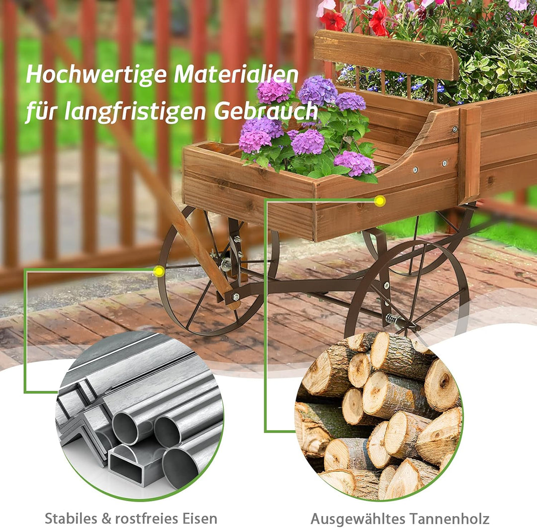 • 🌼【Dekorativ für den Aussenbereich 】Durch seinen rustikalen Stil eignet sich der Pflanzwagen für jeden erdenklichen Aussenbereich und ist dort ein dekoratives Highlight. Mit ihm haben Pflanzen im Garten oder auf der Terrasse einen Platz zum Wachsen.