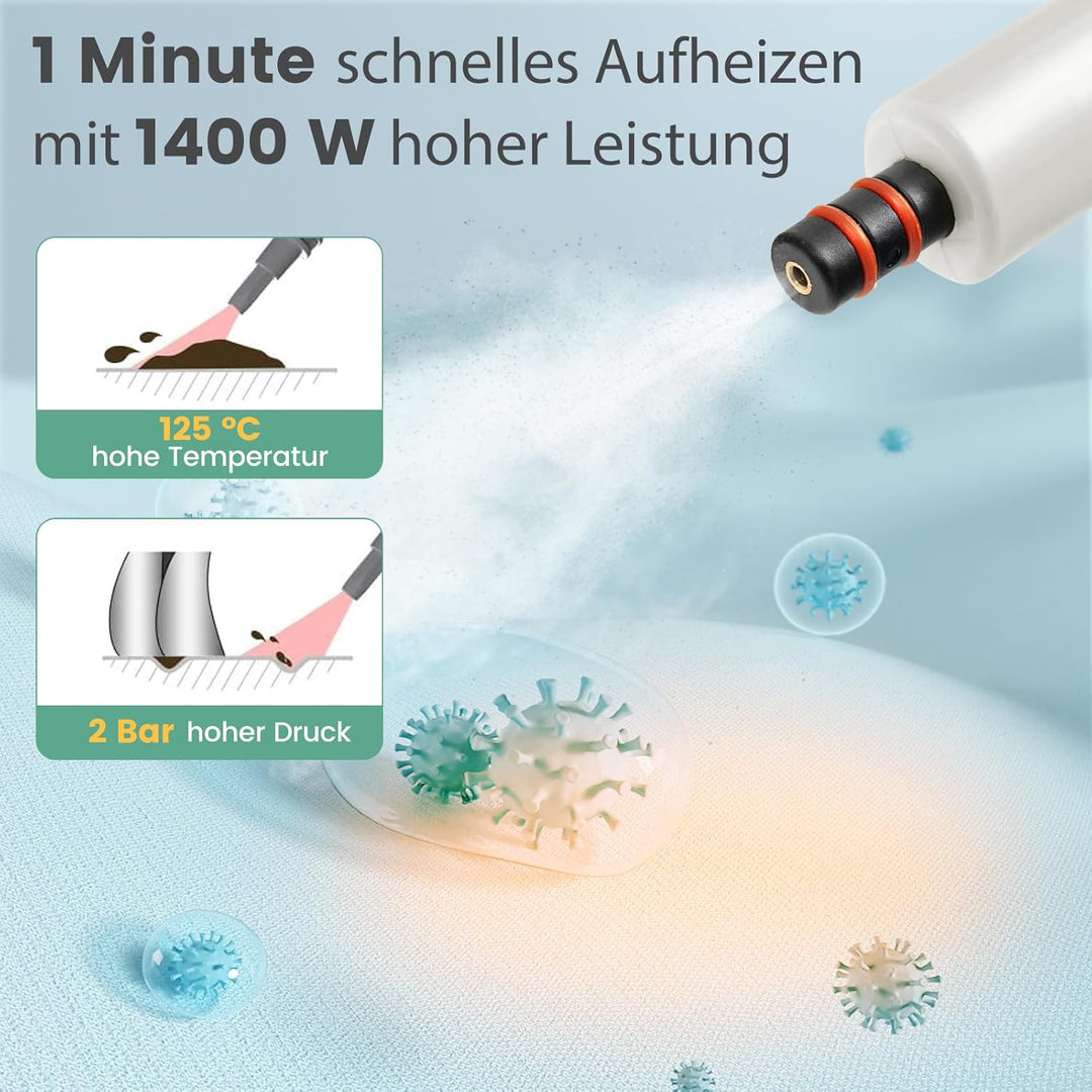- 【Leistungsstarker Handdampfreiniger】Mit 1500W Leistung heizt dieser Dampfreiniger in 1 Minute auf hohe Temperaturen (125℃) auf. Der heisse Dampfausstoss mit 2 Bar Druck sorgt für eine gründliche Reinigung, um Fett und Schmutz zu entfernen. Mit